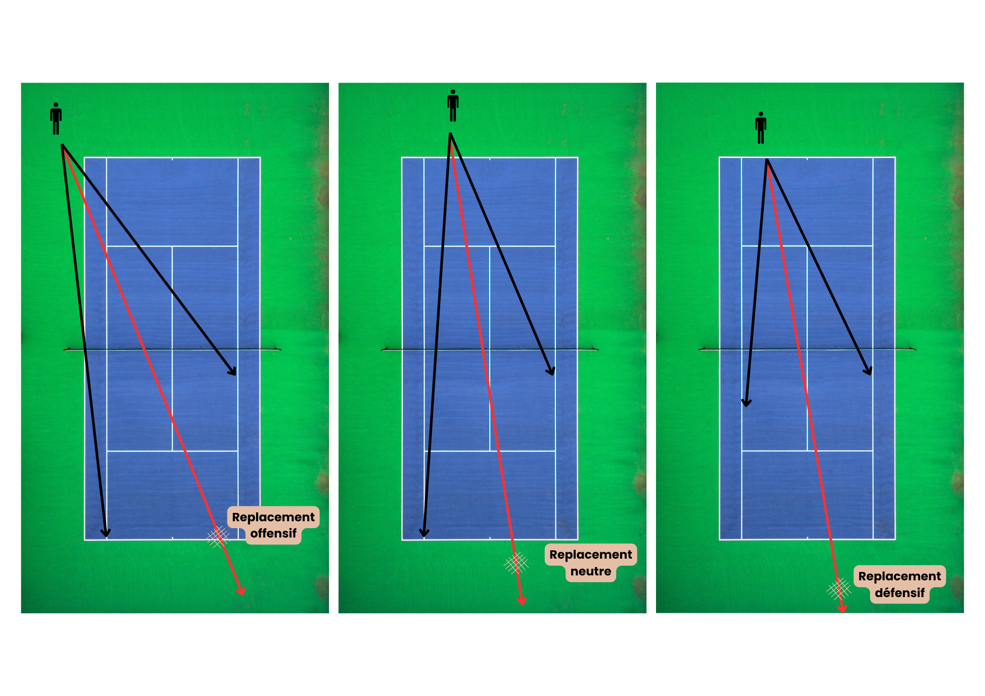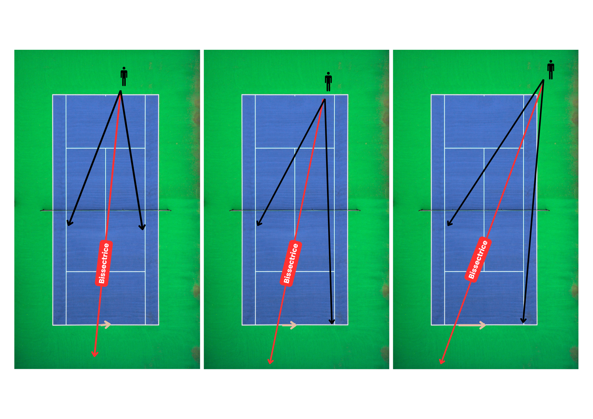 ⛈️ Cas n°3 (droite de l’image) : Je me sens en situation défavorable, je me replace sur la bissectrice en m’éloignant de la ligne de fond (2m voire plus) pour me donner du temps afin de tenter de remettre la balle.